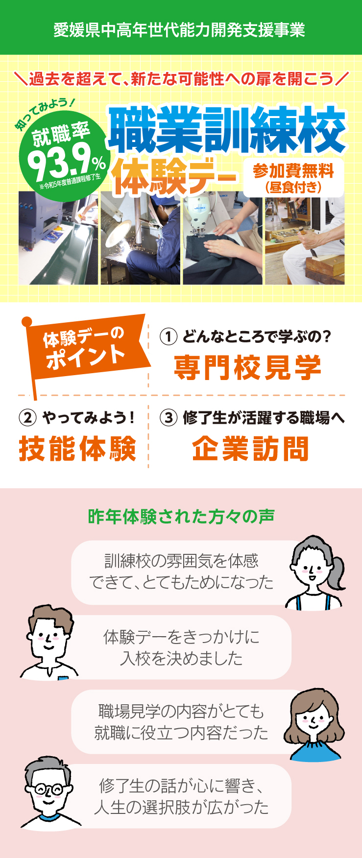 知ると明日のジシンになる! 体験デーのポイント ①どんなところで学ぶの? 専門校見学 ②やってみよう! 技能体験 ③修了生が活躍する職場へ 企業訪問